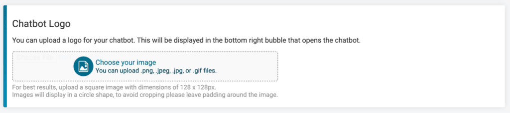 You can now upload a custom logo to personalize your chatbot. Supported file types include .png, .jpeg, .jpg, or .gif.
