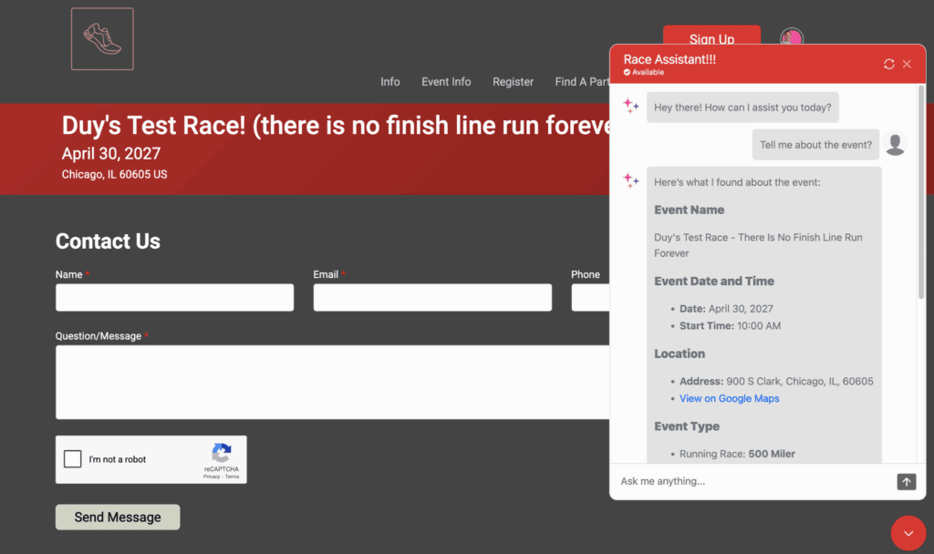 Your chatbot will now automatically pull in your race’s theme colors from Website V2 and update its styling to match. Change your site’s colors? The chatbot will update automatically to keep everything consistent.
