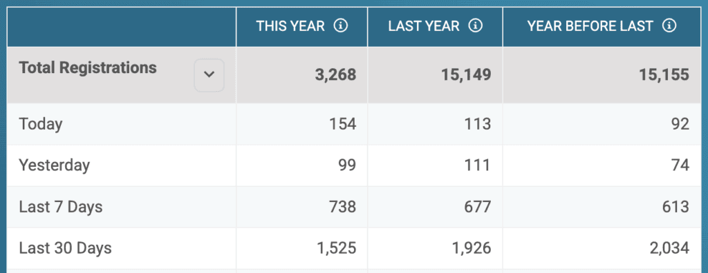 In the screenshot example show above and below, the dashboard graph shows 124 signups, and the drop down shows 99 yesterday. The true number is 99 from yesterday. The 124 comes from the way AWS and Lambdas retry logic works and double counts (one of many reasons we only use Lambdas for non-critical functionality.