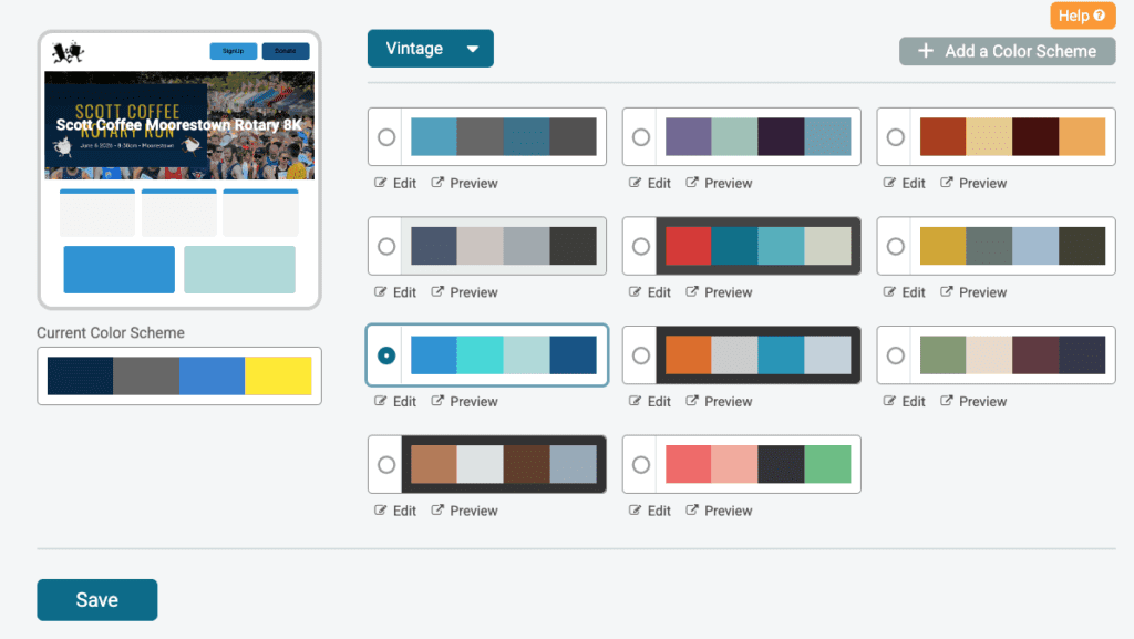 There are 6 color scheme categories. All of the previous color schemes can be found under Vintage. Any custom color scheme that you’ve previously added is under Custom.
