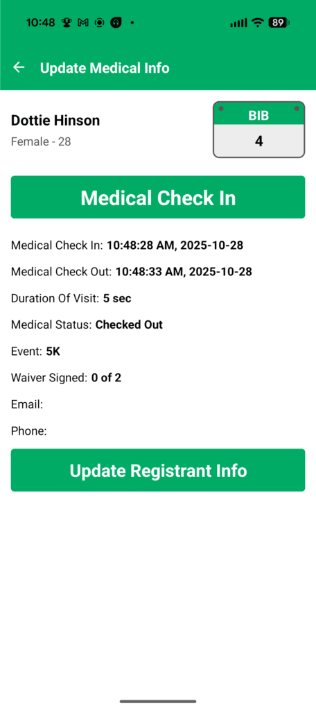 Why this matters: Race directors need to track how long participants spend in medical care for safety protocols and post-race analysis. Previously, you could only see that someone was “checked out” but not when they arrived or how long they were there. This gives you complete visibility into medical tent operations.