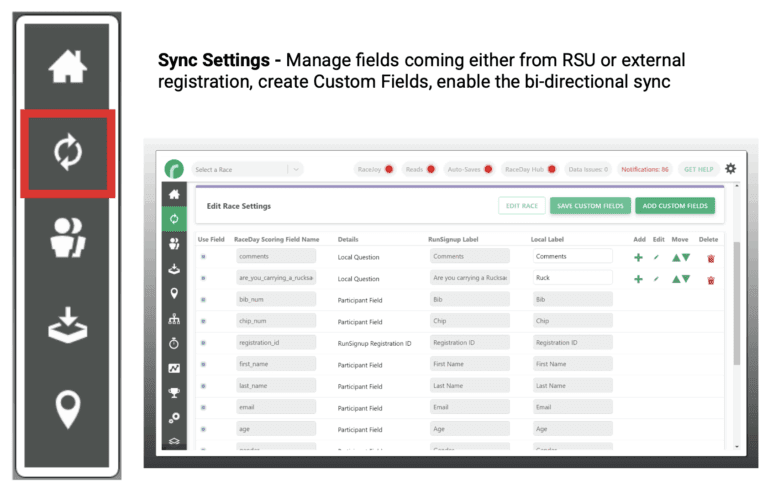 - Sync Settings: RunSignup sync, custom fields, two-way sync settings