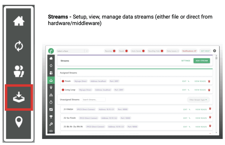 RaceDay Scoring and ChronoTrack Live share a lot of conceptual DNA—streams, timing points, reads, and course logic—though the interface looks different at first.