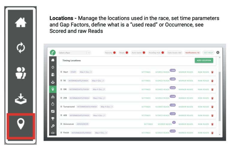- Locations: timing points, filters, read rules, scored vs raw read review
