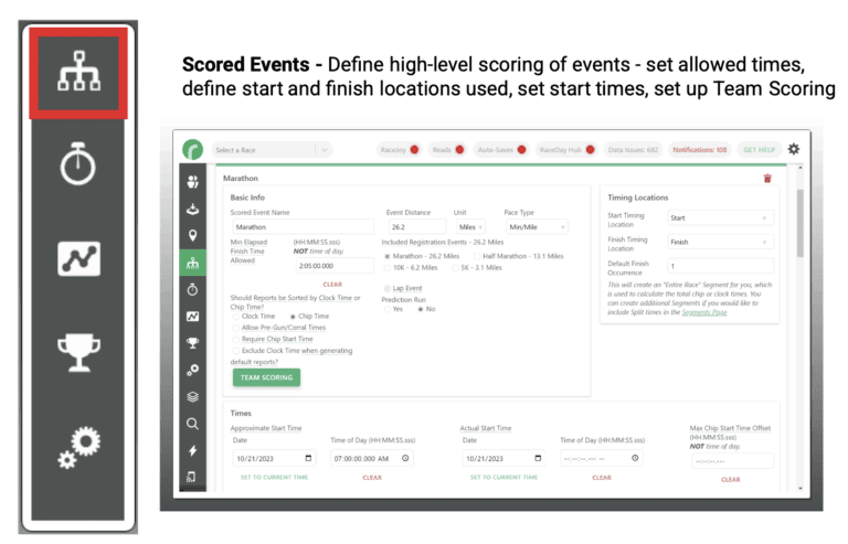 - Scored Events: chip or gun logic, start time, minimum elapsed time, start/finish definitions