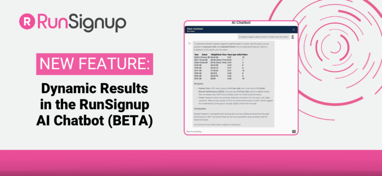 The RunSignup AI Chatbot (BETA) just got smarter. With the new Dynamic Results feature, participants can now get real-time race results directly through the chatbot. Instead of searching multiple the results page, runners can simply ask the chatbot questions like: The chatbot…