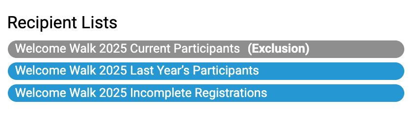 Since Chris was an admin for this event he was able to make use of the previous year’s data and create an email marketing campaign sending several emails encouraging past participants to register again. By using the recipient lists Chris was able to exclude those who had already registered and include any incomplete registrations.