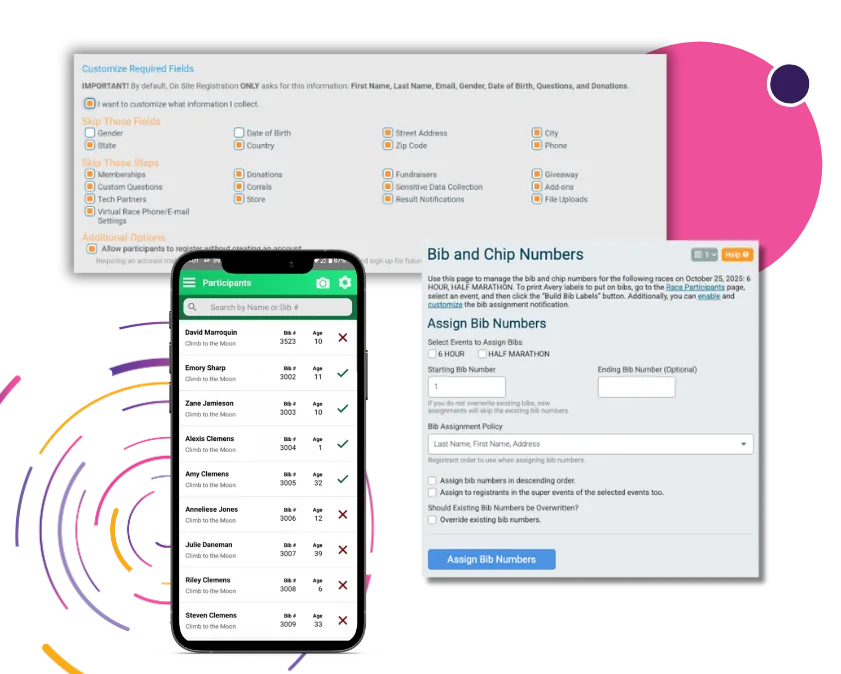 - Bib Management with flexible options to assign your bibs at registration, import your bib numbers, or allow for dynamic bib assignment on-site